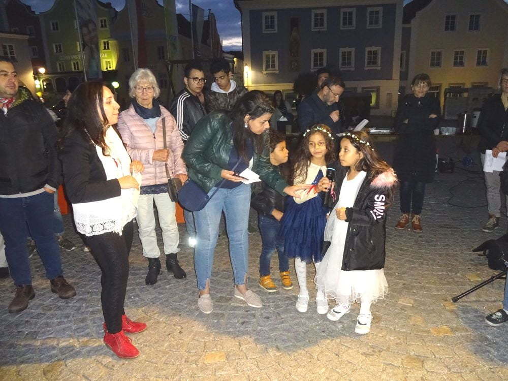 Den Beginn machte der Vertreter des sunnitischen Islam mit einer Erklärung zum Koran und einem liturgischen Gesang. Als Beitrag der kath. Kirche wurde der Sonnengesang des Hl. Franz von Assisi gesungen, bevor aus der Bergpredigt die Botschaft „Macht euch keine Sorgen, euer Vater weiß, was ihr braucht“ gelesen wurde. Viel Applaus gab es für zwei Kinder aus der Koptisch-Orthodoxen Kirche für ihre beiden Lieder, die ein starkes Gottvertrauen in den orthodoxen Kirchen ausdrückten. Eine klare Positionierung für Toleranz, weil Allah alle Menschen liebt, brachte der Beitrag eines Schülers aus Afghanistan, der der schiitischen Glaubensrichtung des Islam angehört. Eine Auslegung der Wochenspruchs „Lass dich nicht vom Bösen überwinden, sondern überwinde das Böse mit Gutem“ und das allen christlichen Kirchen gemeinsame Vater Unser bildeten den Beitrag der Evangelischen Kirche. Mit der Nennung von Notsituationen in verschiedenen Bereichen und einer Minute Schweigen wurde das gemeinsame Gebet abgeschlossen. Bei Tee und Kuchen klang der Abend aus.