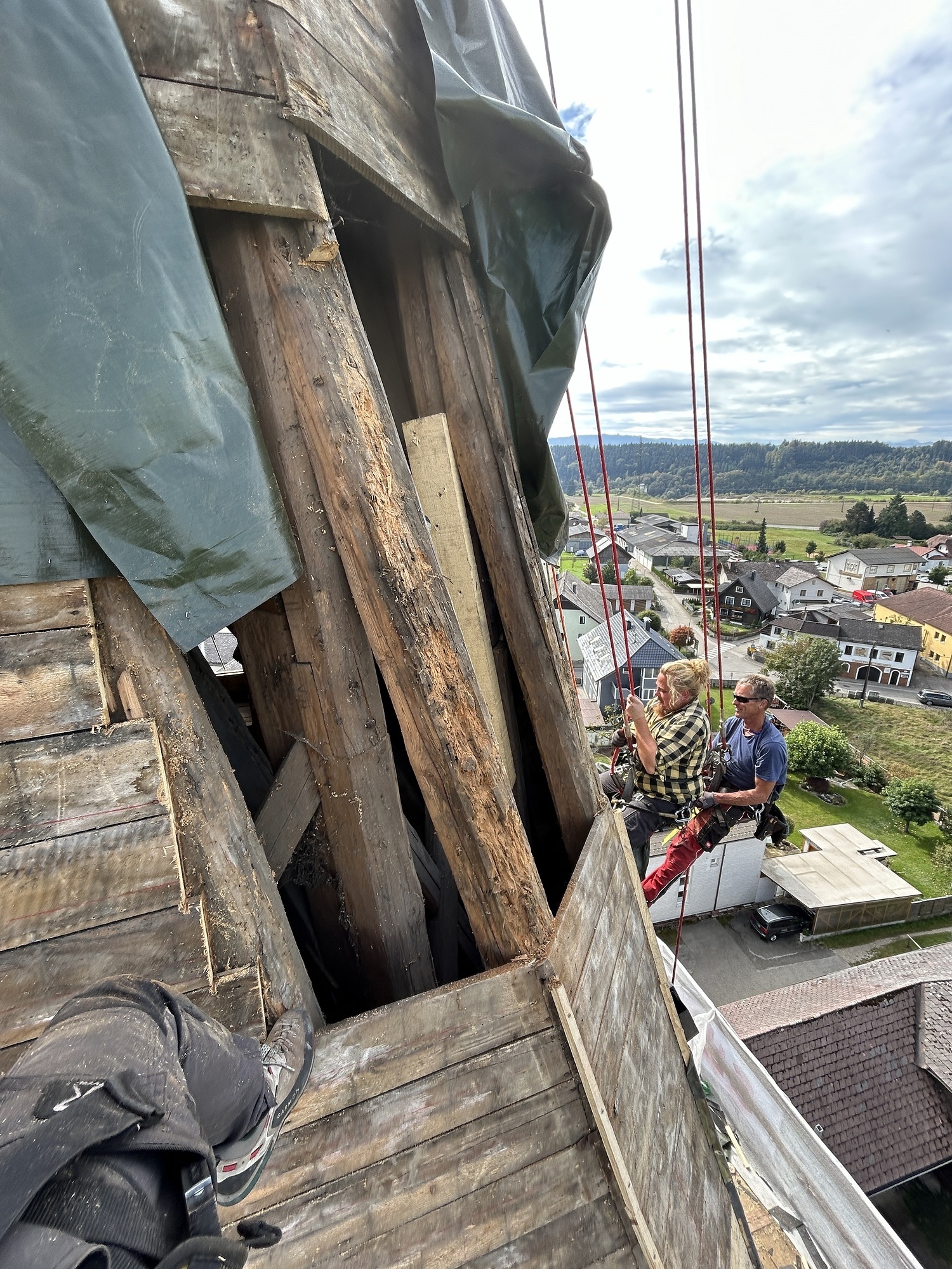 Im August 2024 begannen die Arbeiten am Kirchturm der Pfarrkirche Regau. Aktuell im November wird der Turmhelm renoviert. Die Turmfassade wird ab dem Frühjahr 2025 ausgeführt.