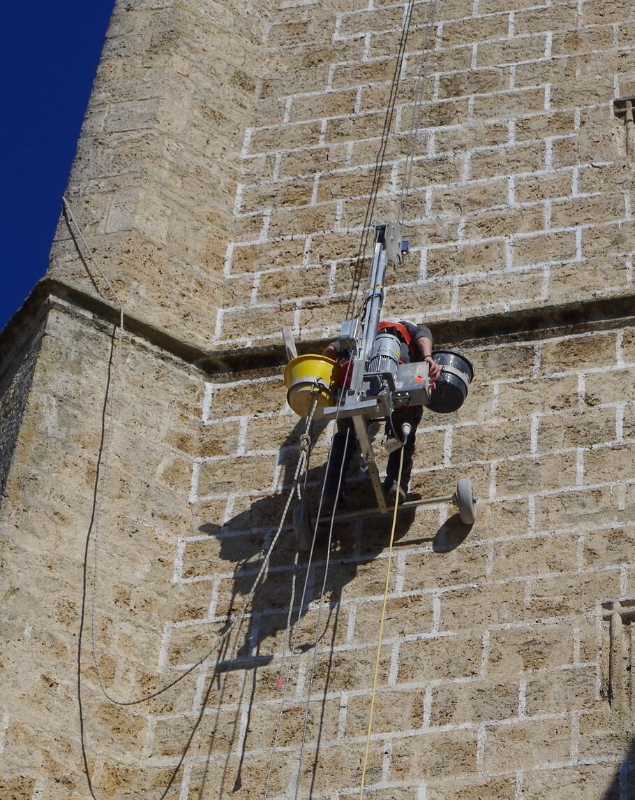Von Di. 9. 9. bis Mi. 1. 10. waren die Männer von der Fa. Steinmetz Reichl, Szb., beschäftigt, die Tuffstein unseres Turmes und der Westseiten a) zu reinigen, b) die fehlenden Tuffgesimse zu erneuern und nachzubauen und c) die ehemalige Fugenmalerei wieder anzubringen.