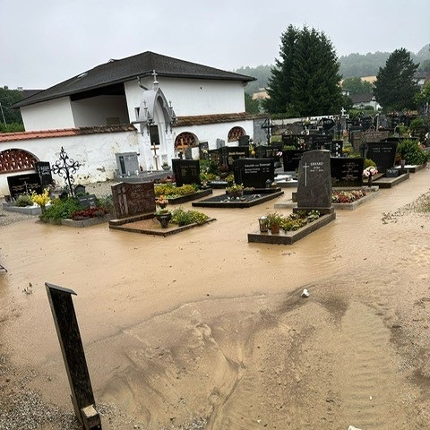 Nicht nur zahlreiche Wohngebäude waren vom Starkregen am Abend des 3. Juli 2025 in Dietach betroffen. Auch unser Friedhof wurde überflutet und vermurt.