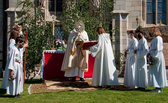 Die Monstranz mit der Hostie - getragen vor die Tore der Stadtpfarrkirche Fronleichnam 2021 Das Gedenken an die Einsetzung der Eucharistie als eindrucksvolles Zeichen für eine lebendige Pfarrgemeinde