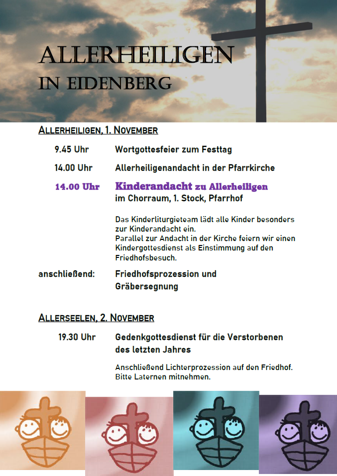 Einladung zur Kinderandacht zu Allerheiligen am Dienstag, 1. November 2022 um 14.00 Uhr im Chorraum, 1. Stock, Pfarrhof mehr: Einladung zur Kinderandacht zu Allerheiligen