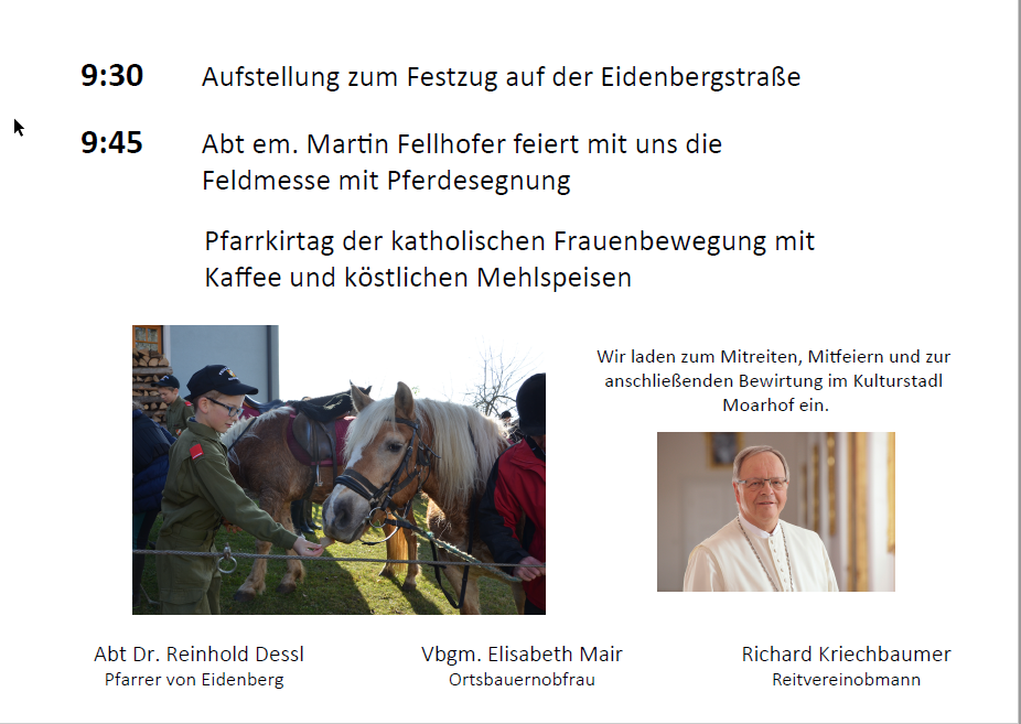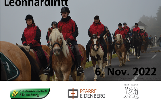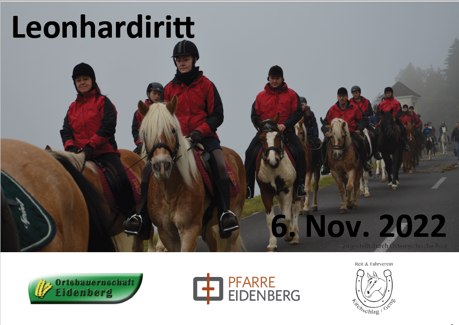 Einladung zum Leonhardiritt - Kinderfeier Am So. 6. November 2022 um 9.30 Uhr findet in Eidenberg der Leonhardiritt mit Festzug statt. Abt. em Martin Felhofer vom Stift Schlägl zelebriert die Feldmesse. mehr: Einladung zum Leonhardiritt - Kinderfeier
