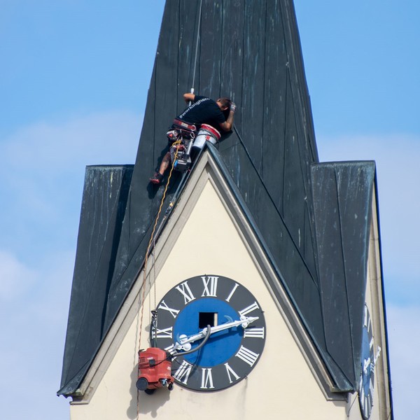 Schon von Weitem waren in der KW 34 die sehr erstaunlichen und artistisch anmutenden Arbeiten am Kirchturm unserer Pfarrkirche zu sehen, die von der Firma Mayerl GmbH aus Dölsach in Osttirol durchgeführt wurden.