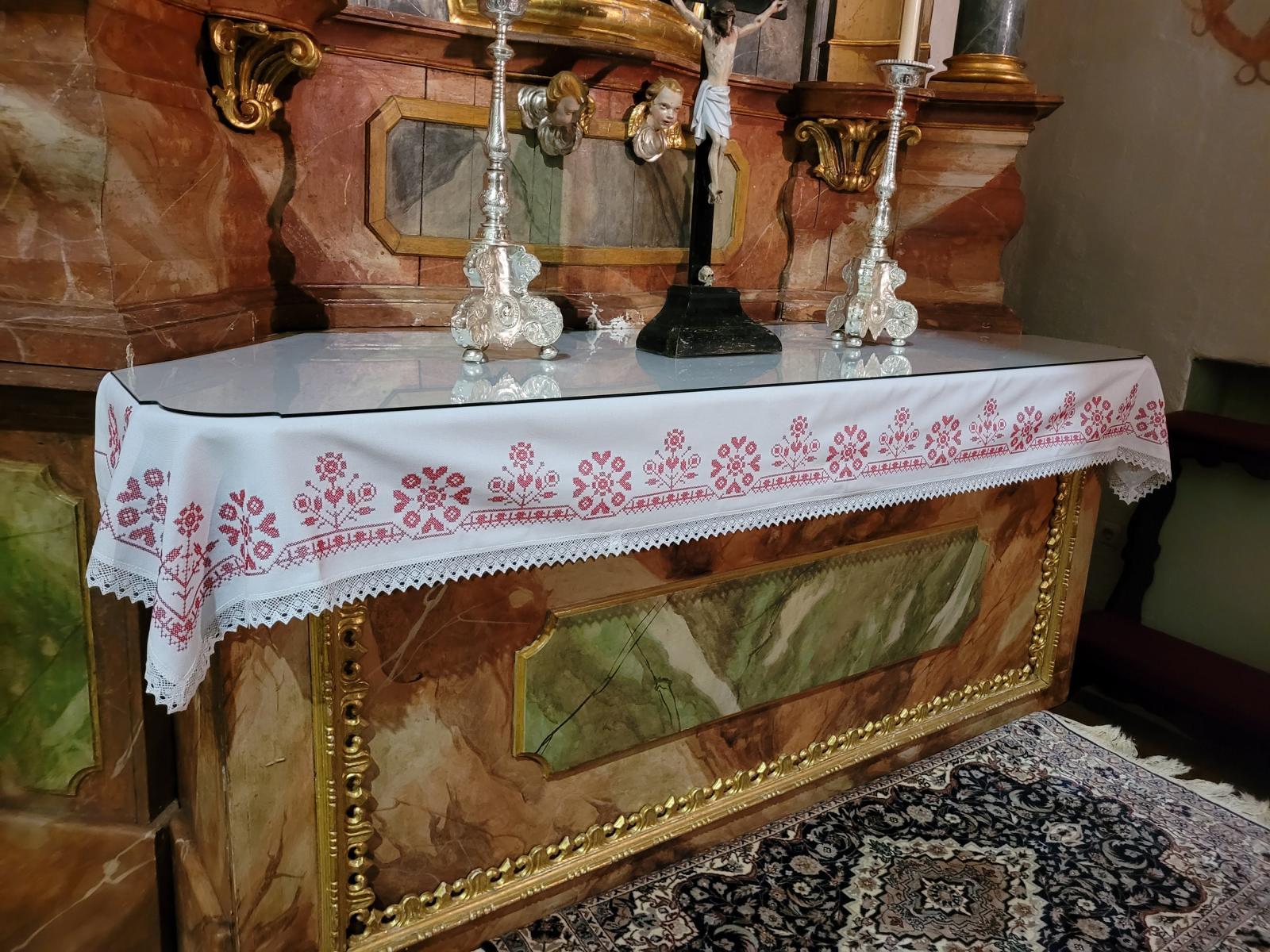 Am Samstag, den 27. November 2021 waren alle Altäre und das Seitenbord mit neuen gestickten Altartüchern geschmückt. Helene Riedl arbeitete ehrenamtlich fünf Monate an dieser Kreuzsticharbeit. Die Motive zeigen das Sonnensymbol, ein uraltes Zeichen für den allmächtigen Gott und den Lebensbaum.