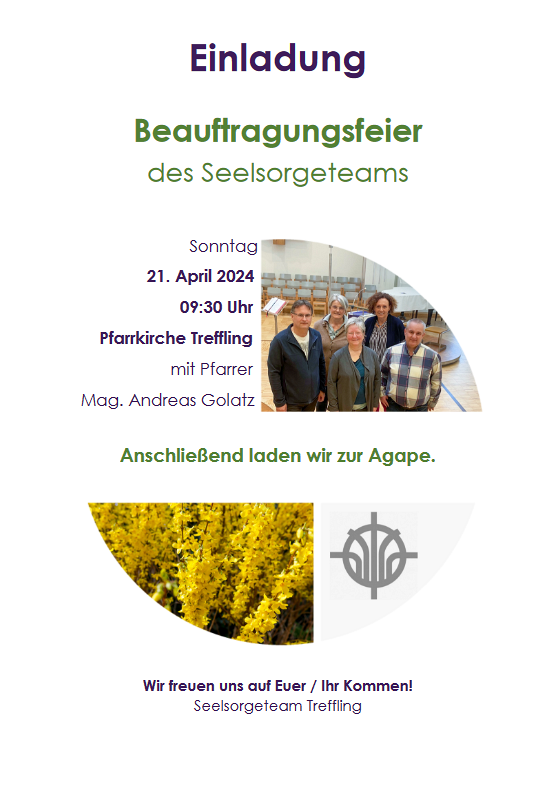 Am Sonntag, 21. April 2024 fand in Rahmen eines Festgottesdienst die Beauftragsfeier unseres Seelsorgeteams mit musikalischer Umrahmen des AHZ-Chors statt. Unter den Link https://www.teambuntesfernsehen.at/das_neue_seelsorgeteam sehen Sie eine Zusammenfassung dieser Feier.